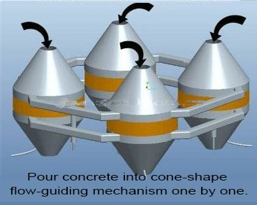 4. When concrete of the upward cone-shape flow-guiding mechanism freeze,flipping the cone-shape flow-guiding mechanism with crane and then pour concrete into the downward cone-shape flow-guiding mechanism.